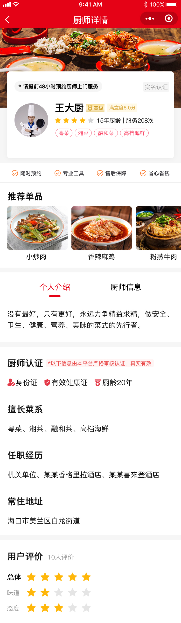主要用于入驻厨师的展示,含厨师的厨龄、服务评价、擅长菜品等相关信息
